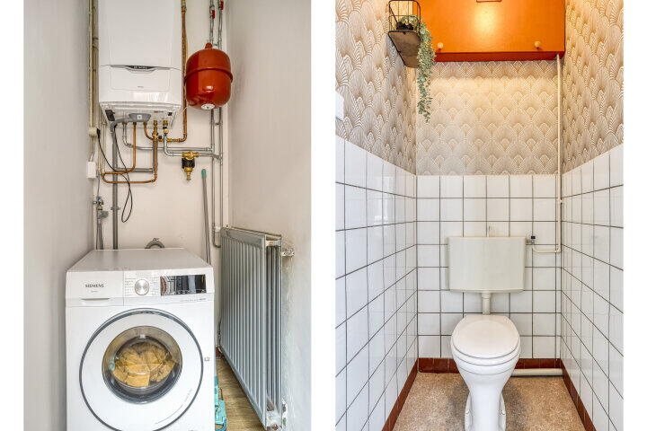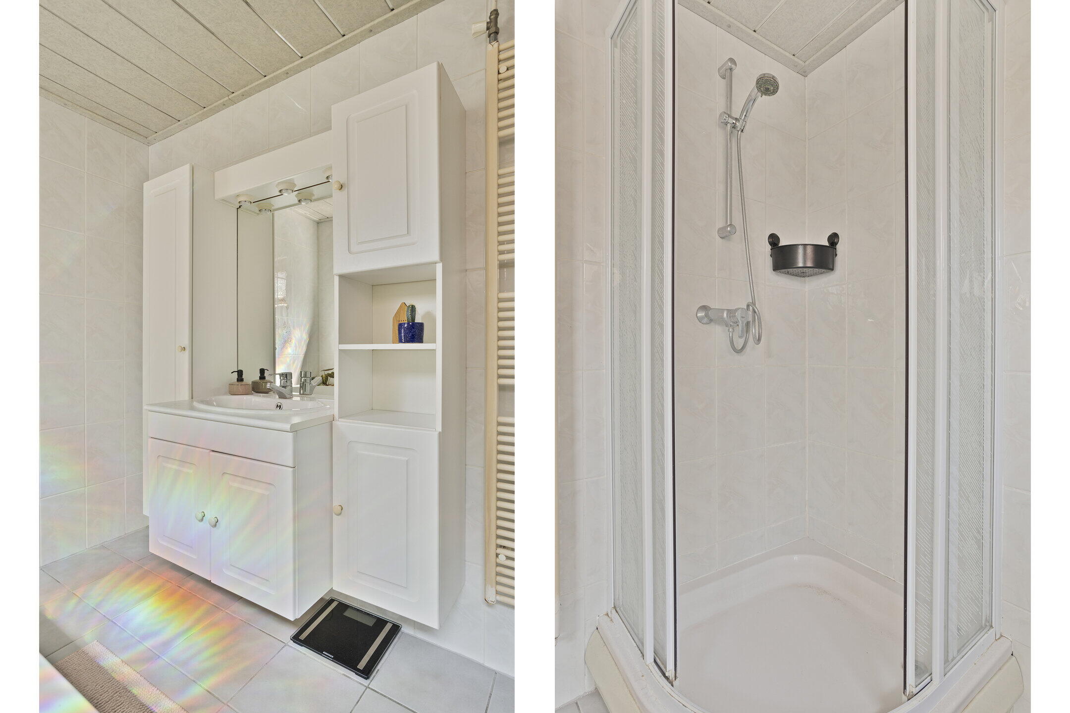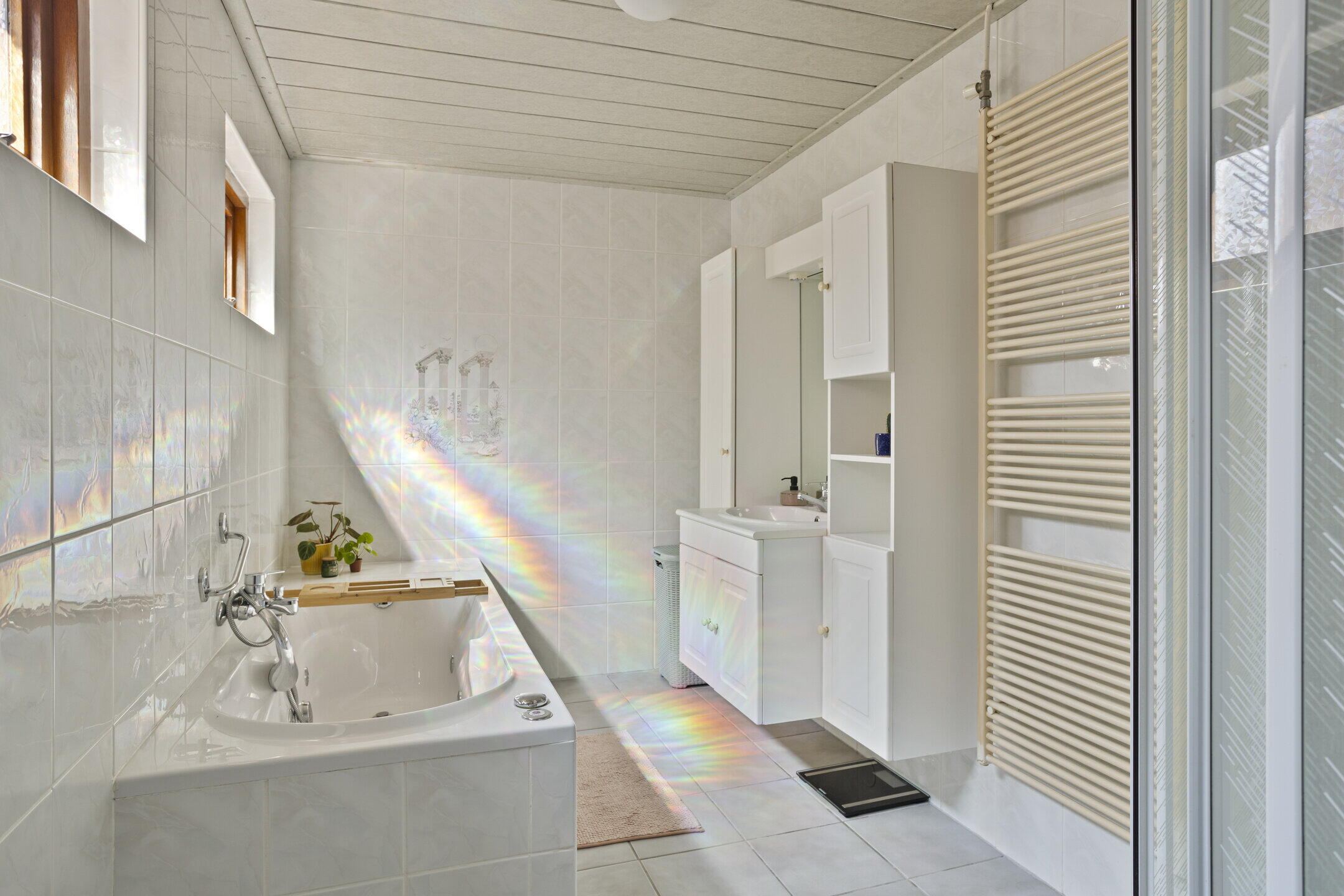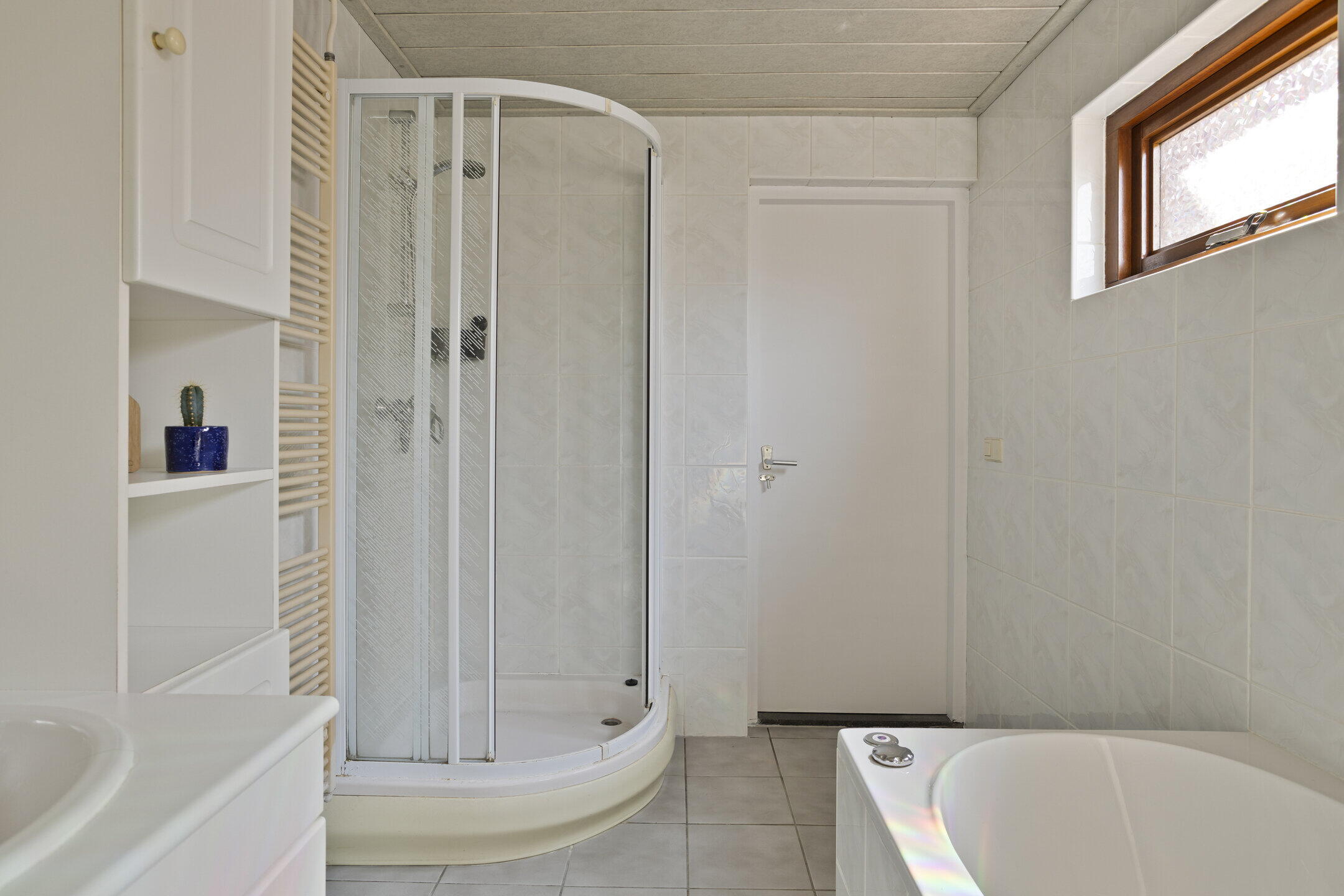 Op de begane grond vind je naast een toilet ook de zeer ruime badkamer. Deze is afgewerkt met naturel tegels en voorzien van een douche, ligbad en wastafelmeubel – alles wat je nodig hebt voor een ontspannen moment.