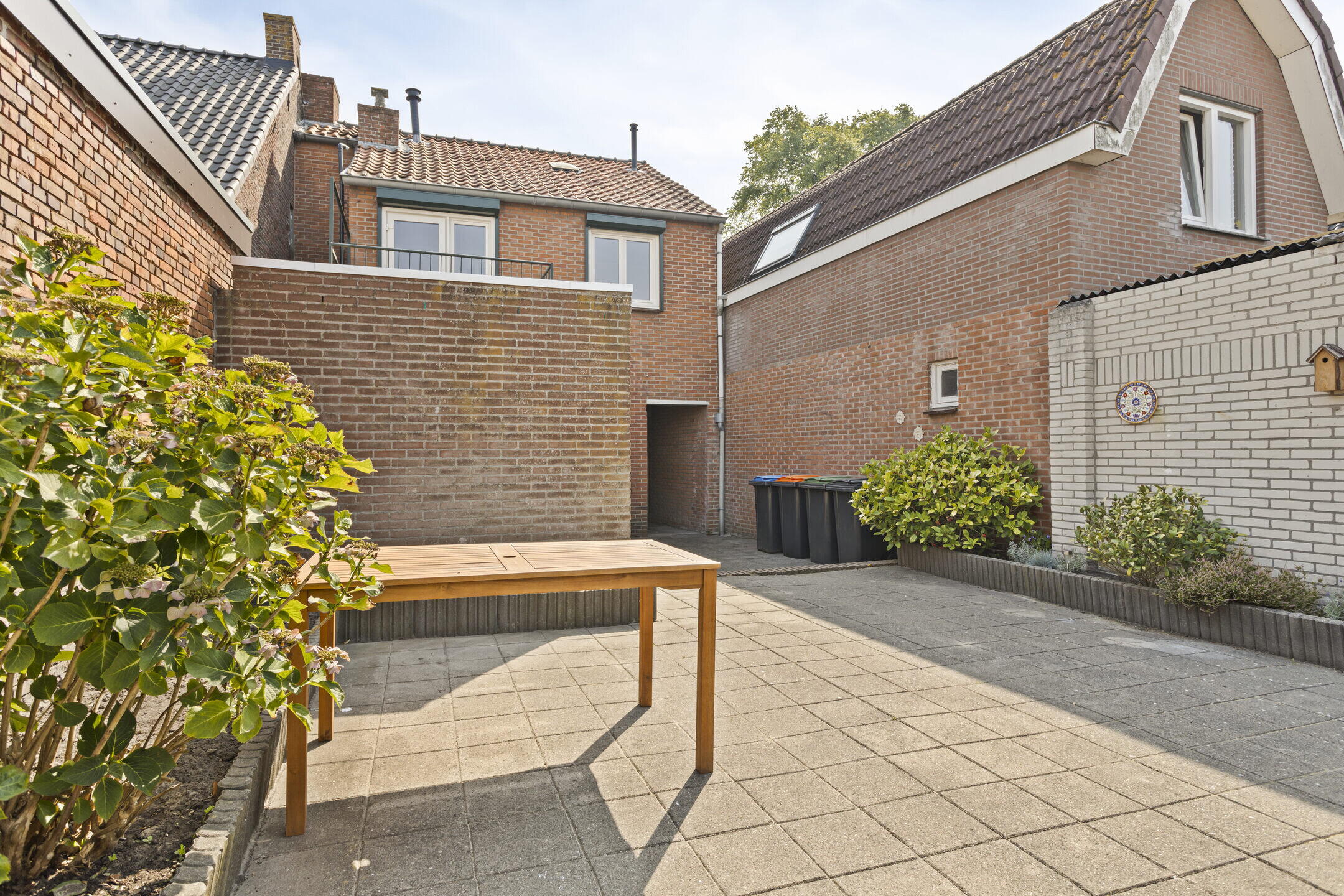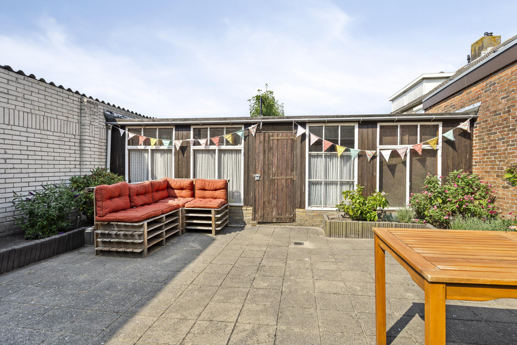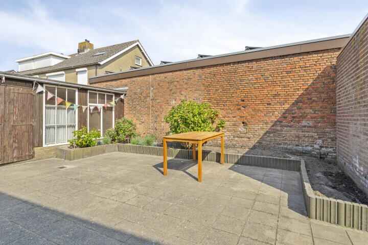 De achtertuin is een fijne plek om te vertoeven. Strak bestraat en ruim opgezet, waardoor je meerdere zithoeken kunt creëren. De borders met groen zorgen voor een gezellige en levendige uitstraling. Hier kun je zowel genieten van de zon als van het buitenleven.