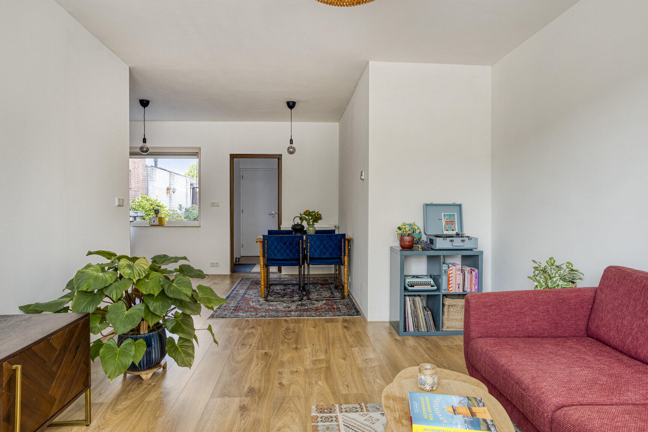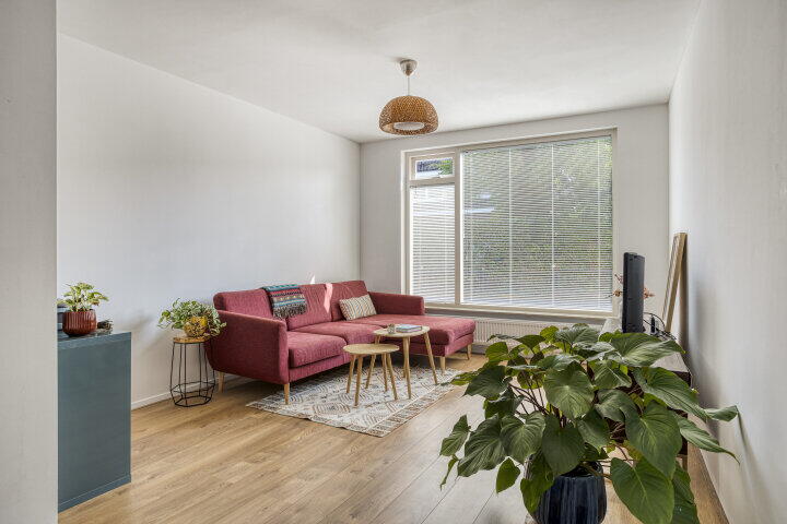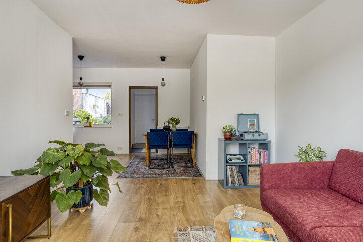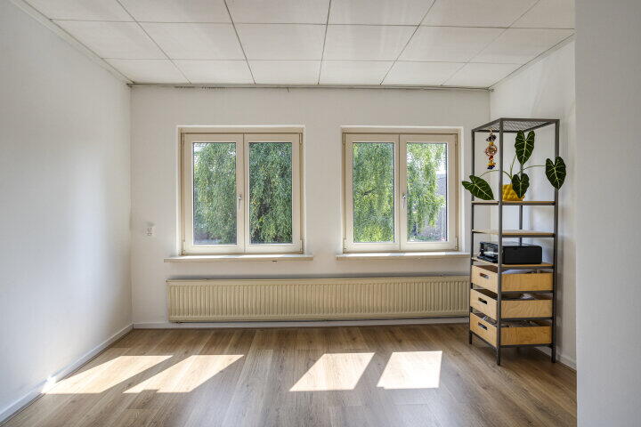 De grote woonkamer is een echte blikvanger. Aan de voorzijde bevindt zich een comfortabele zithoek, terwijl aan de achterzijde ruimte is voor een gezellig eetgedeelte. De strak gestucte muren en de overvloed aan daglicht zorgen voor een moderne, frisse uitstraling.