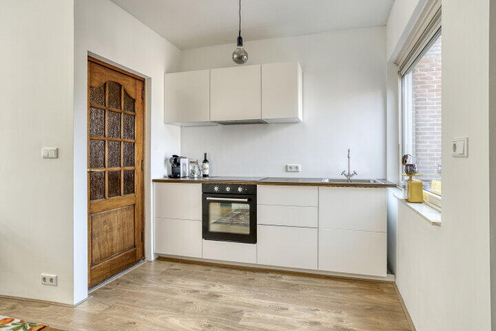 Aansluitend vind je de moderne open keuken. Dankzij de open indeling blijft koken gezellig: terwijl jij aan de slag gaat op de inductiekookplaat of de oven gebruikt, hou je contact met je gezelschap aan tafel.